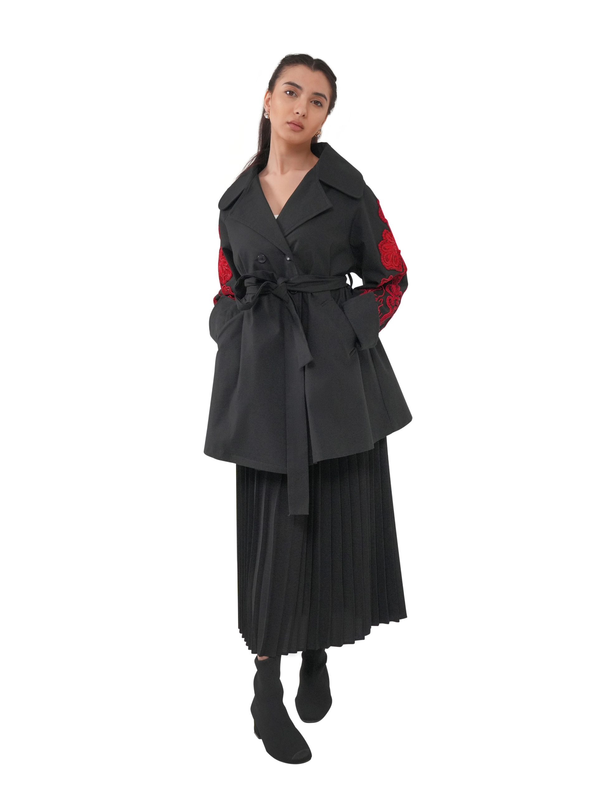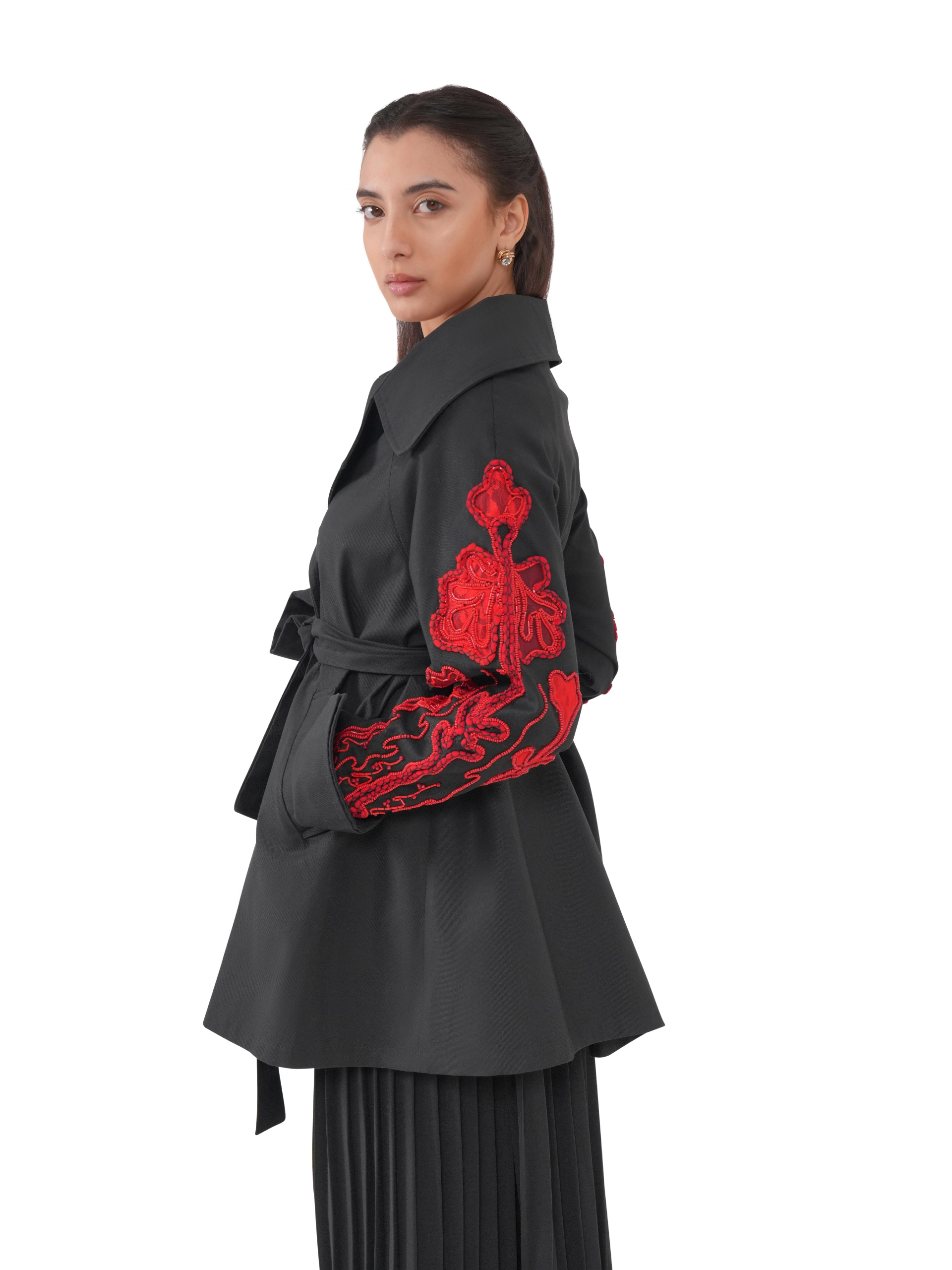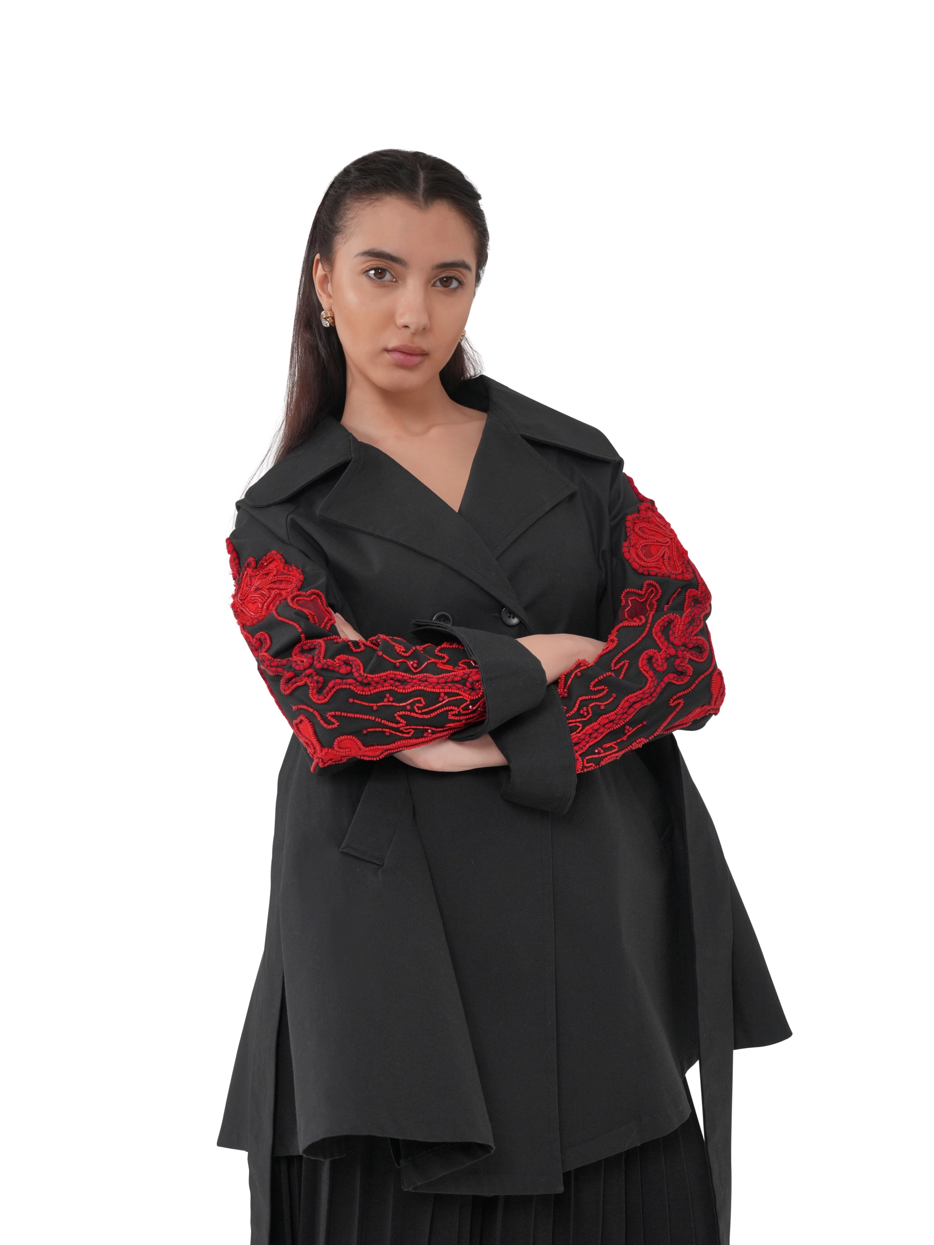 Elegant jacket made of denim fabric, featuring a loose fit and sleeves embroidered in red.