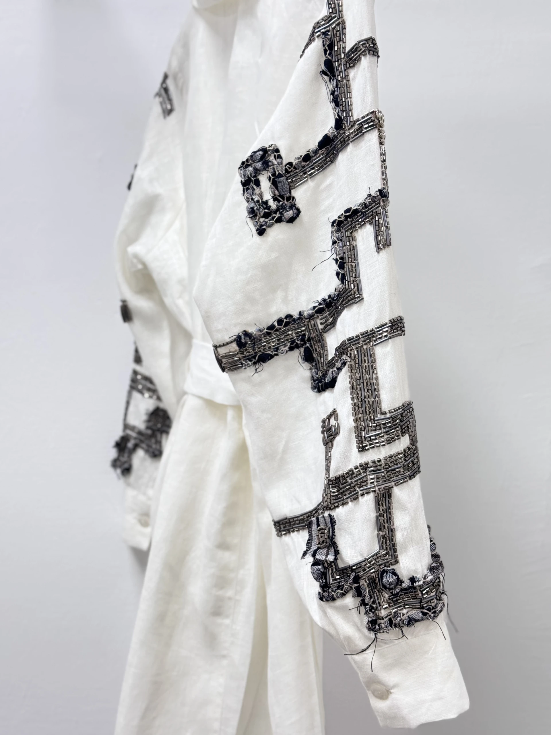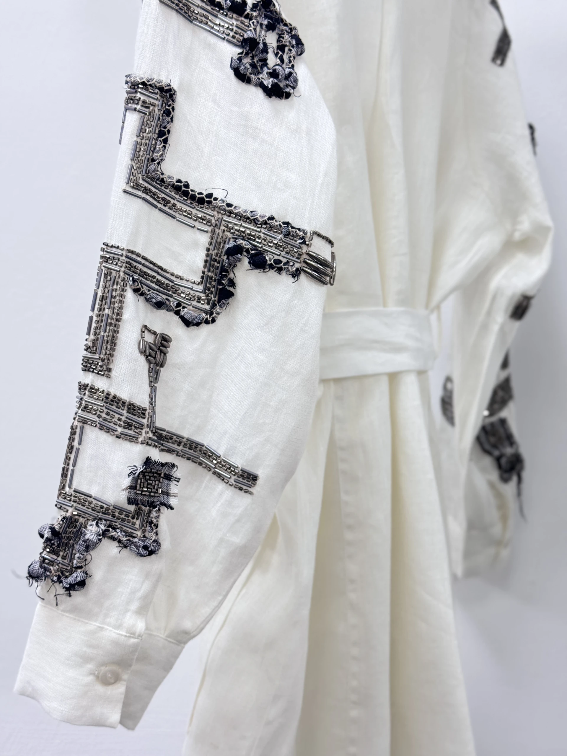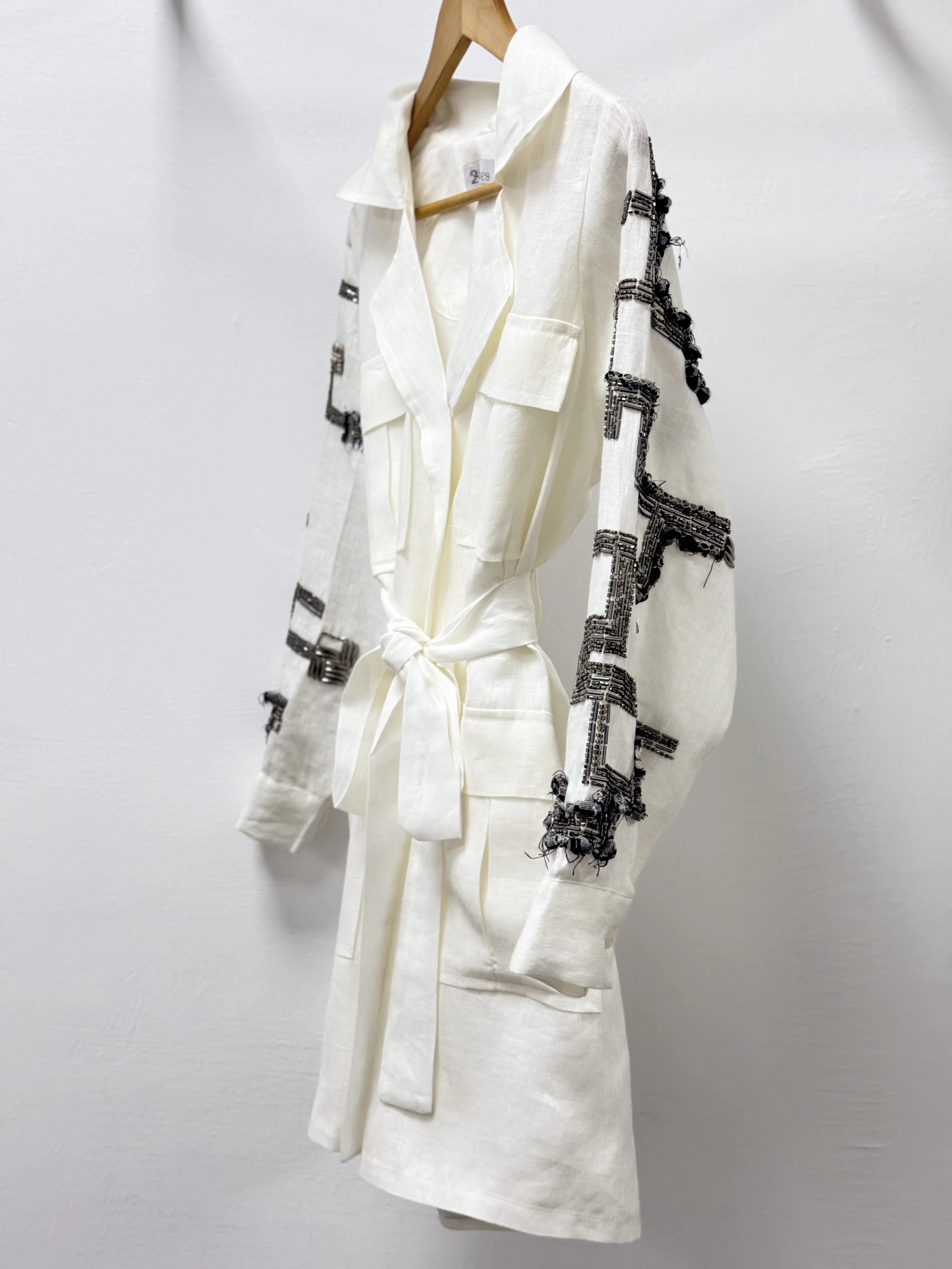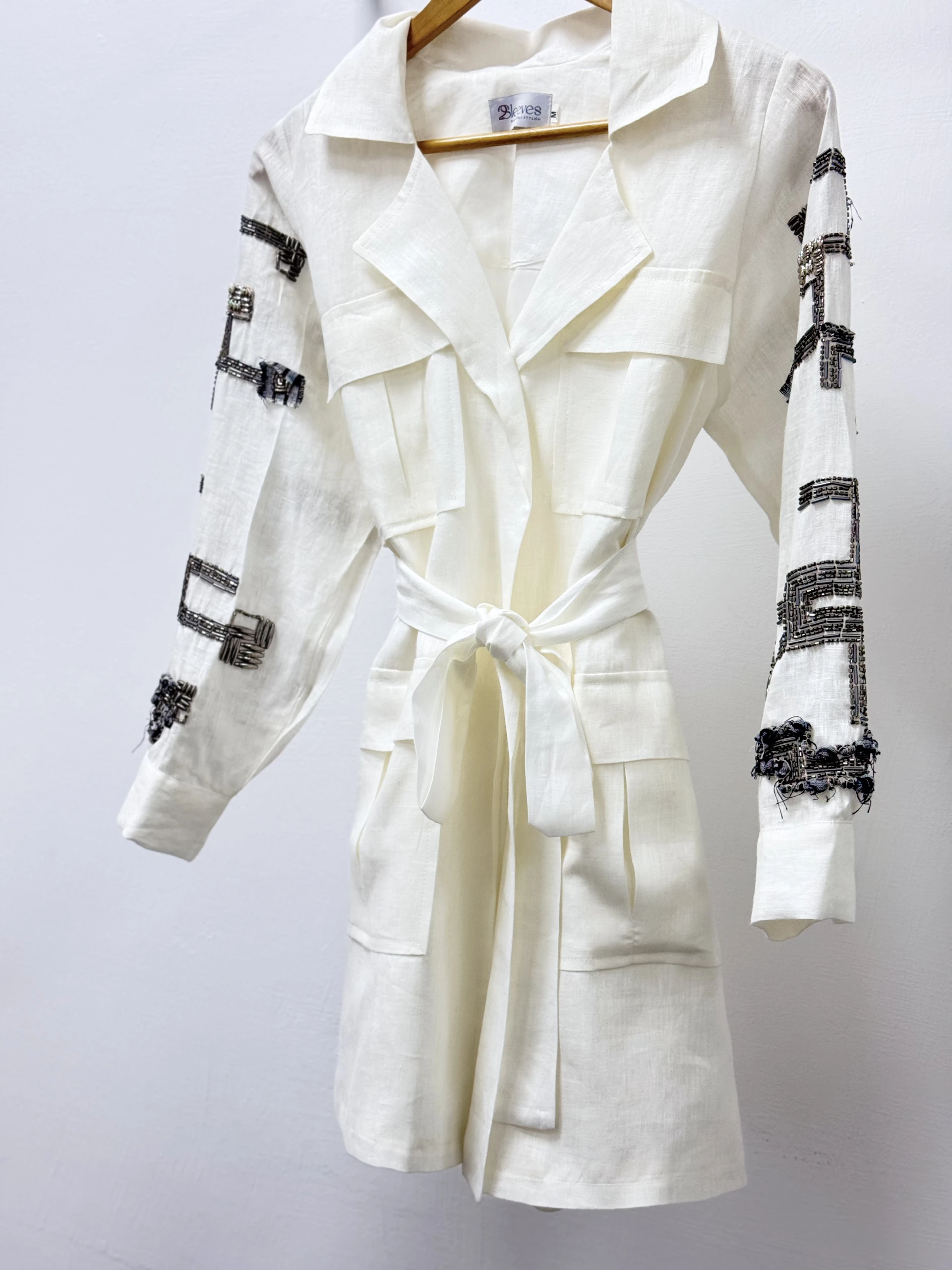 A lined jacket made of authentic Indian linen fabric with sleeves embroidered with beads and threads.