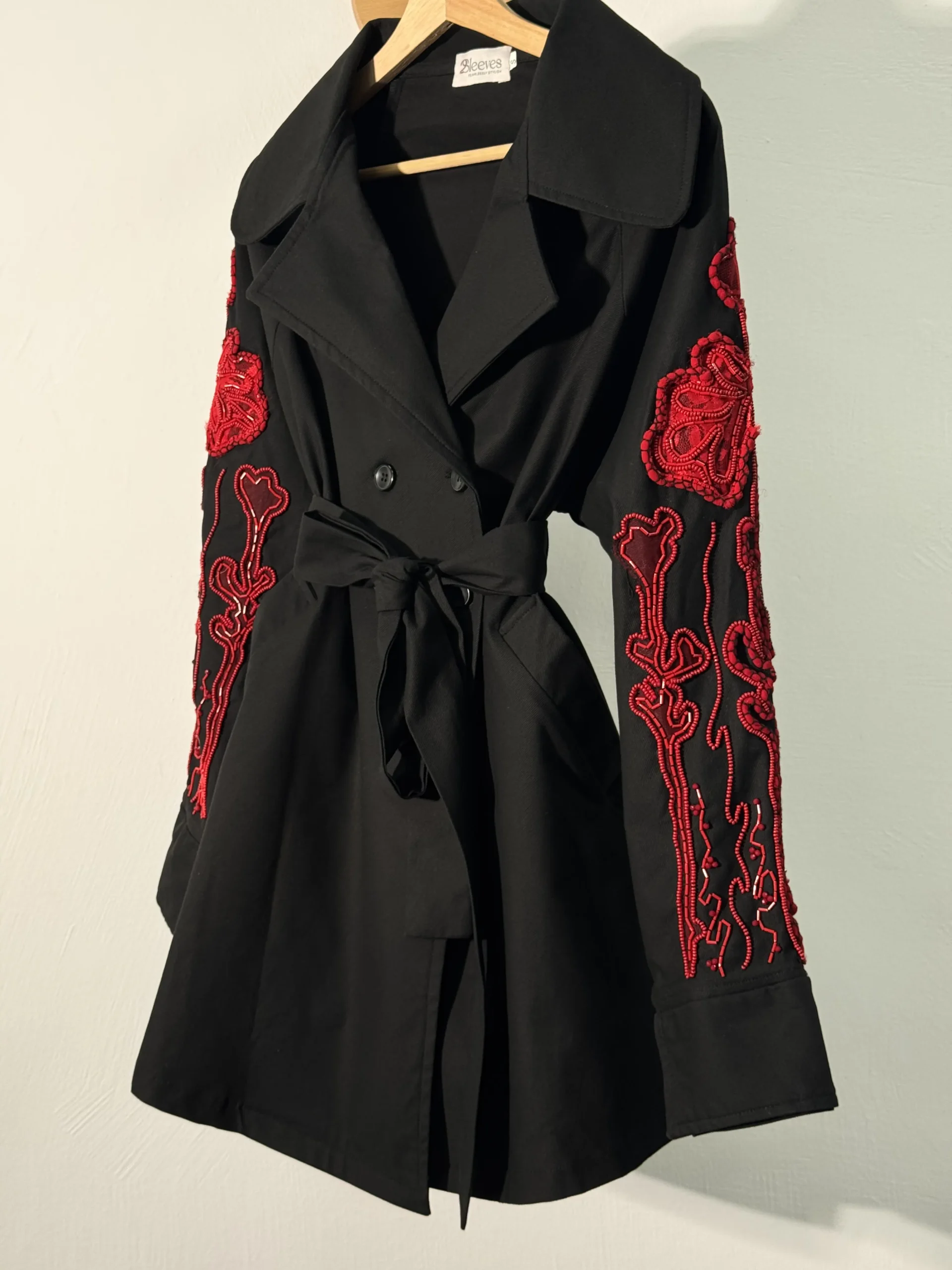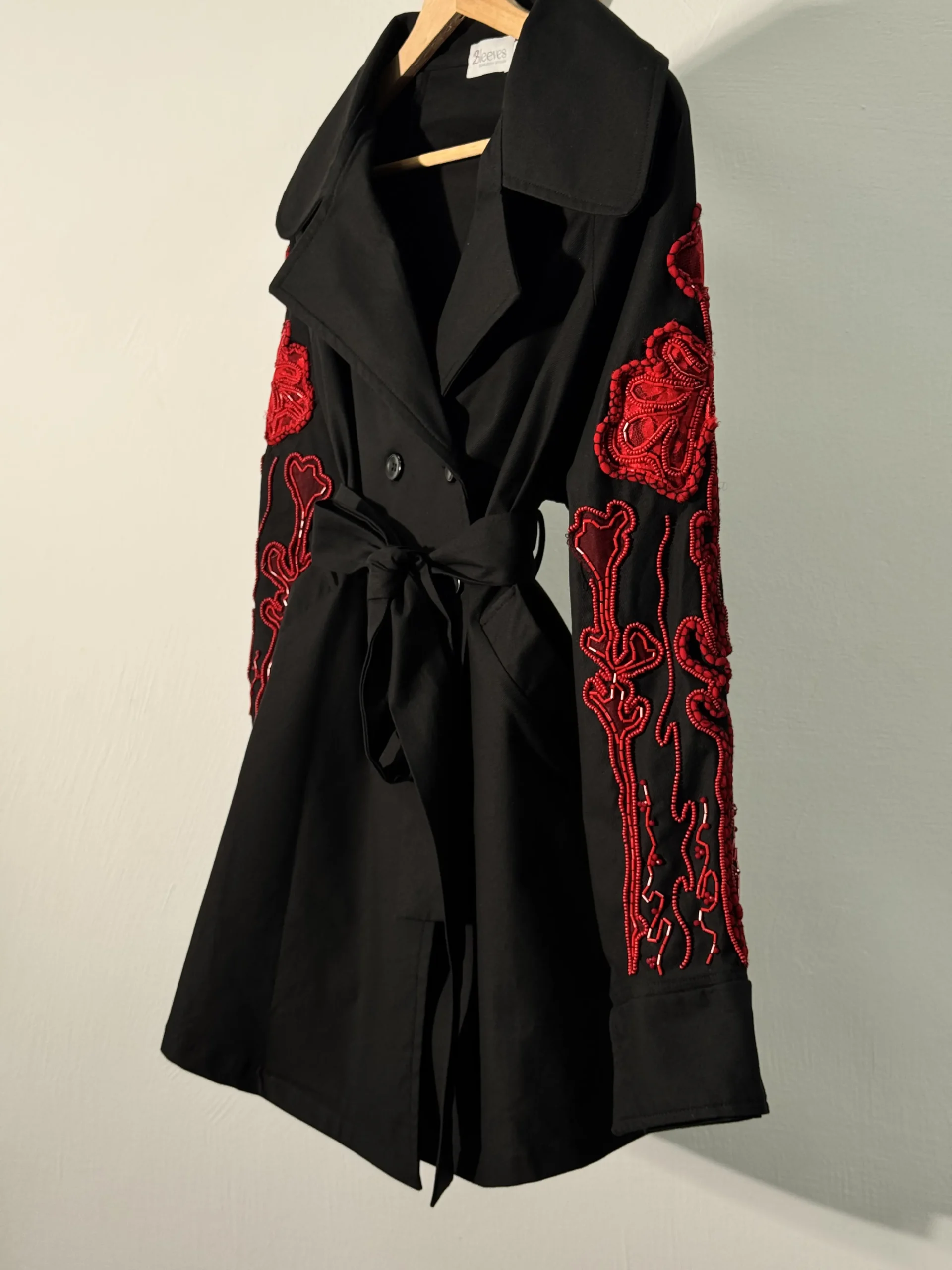 جاكيت اسود بحزام من قماش المكسيماره الجينز بقصة واسعه واكمام مشكوكه بالخرز الياباني والقماش